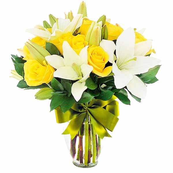 24 rosas amarillas con lilis / jarrón con flores amarillas