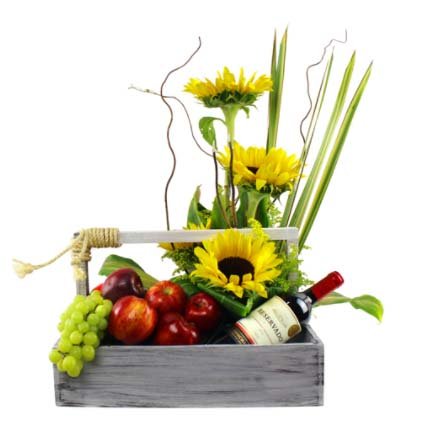 Arreglos frutales con flores / Girasoles con fruta y vino