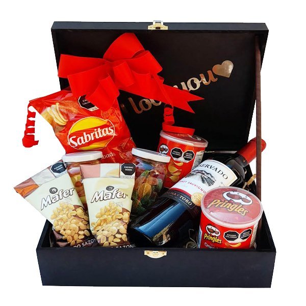 Caja de regalo sorpresa / Caja con vino tinto y snacks
