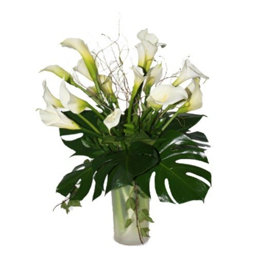 Hermoso florero con alcatraces para presentar tus condolencias con elegancia y buen gusto.