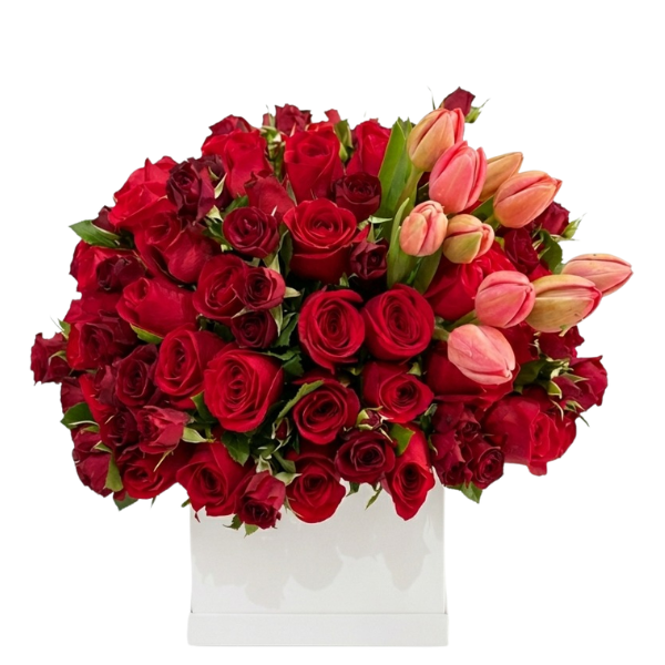 Sorprende con un diseño floral sofisticado que combina pasión, elegancia y delicadeza. Pasión Elegante es una exclusiva caja blanca cuadrada con 40 rosas rojas, 20 mini rosas rojas y 10 tulipanes rosas, creada por Acentofloral para quienes desean expresar sentimientos profundos con un detalle verdaderamente espectacular.