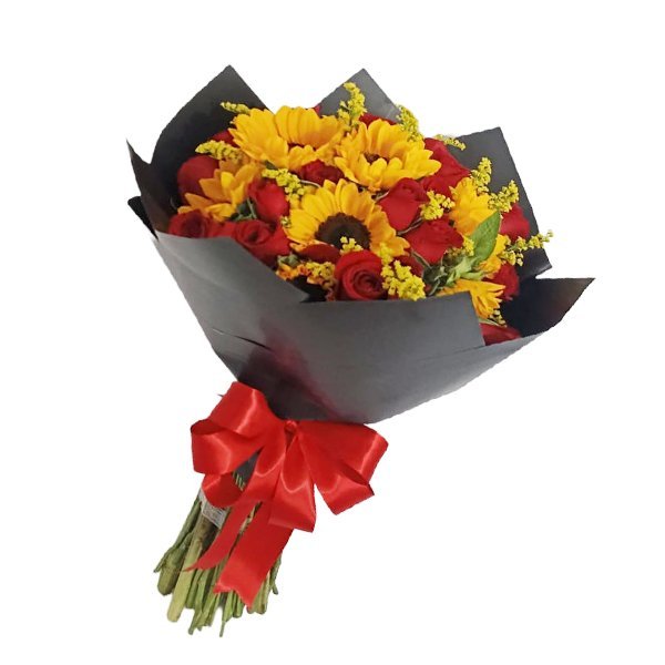 Cada rosa roja es un símbolo clásico de amor profundo y compromiso, ideal para expresar sentimientos sinceros y duraderos. Los girasoles, por su parte, representan la luz, la esperanza y la felicidad, convirtiendo este ramo en un regalo que irradia vida y optimismo. El follaje solidago añade un toque fresco y natural, mientras que el moño rojo que lo acompaña resalta la elegancia y hace de este ramo un presente inolvidable.