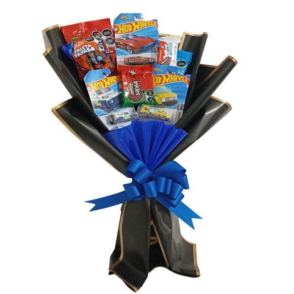 El ramo puede incluir una variedad de modelos de coches, cada uno con diferentes colores y estilos, lo que añade diversidad y atractivo visual. Generalmente, se usan lazos, cintas o papel de colores brillantes para complementar los vehículos y darle un toque festivo y temático. Es una idea perfecta para sorprender a un amante de los autos en una ocasión especial.