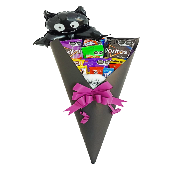 Este espectacular ramo está cuidadosamente diseñado con un toque misterioso: envuelto en elegante papel negro, adornado con un lazo color morado intenso —símbolo de magia y misterio— y coronado por un adorable globo de murciélago, el guardián perfecto de este festín de sabores. 🦇💜