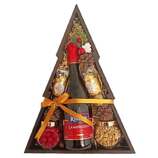 «Exclusiva caja rústica de madera en forma de pino navideño que contiene una botella de vino tinto Riunite Lambrusco, dos elegantes estuches de Ferrero Rocher de tres piezas, un frasco de cerezas y otro de cacahuates. Decorada con delicadas mini piñas y un pick festivo, esta caja es el obsequio ideal para celebrar la Navidad con un toque de sabor, elegancia y espíritu navideño. Perfecta para compartir en reuniones y crear momentos inolvidables en esta temporada especial.»